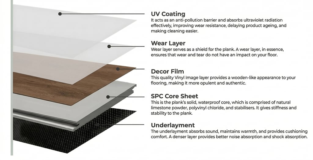 A multi-layered innovation combining UV protection, wear resistance, authentic decor, a rigid core, and superior underlayment for unmatched durability and comfort.
